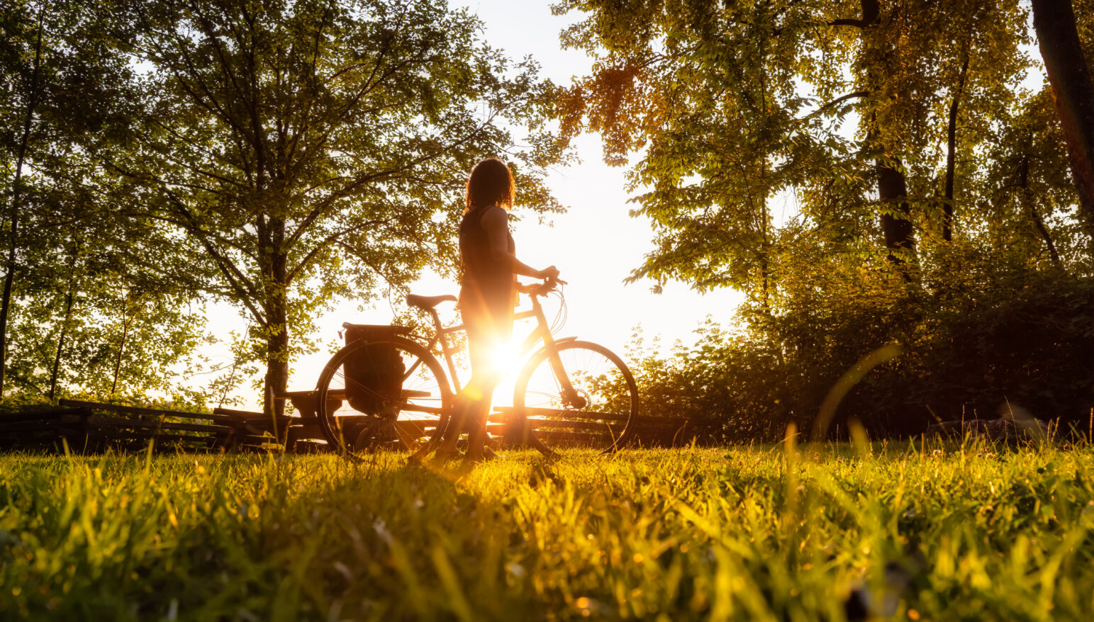 Adventurous White Cacasusian Woman with a bicycle in a park